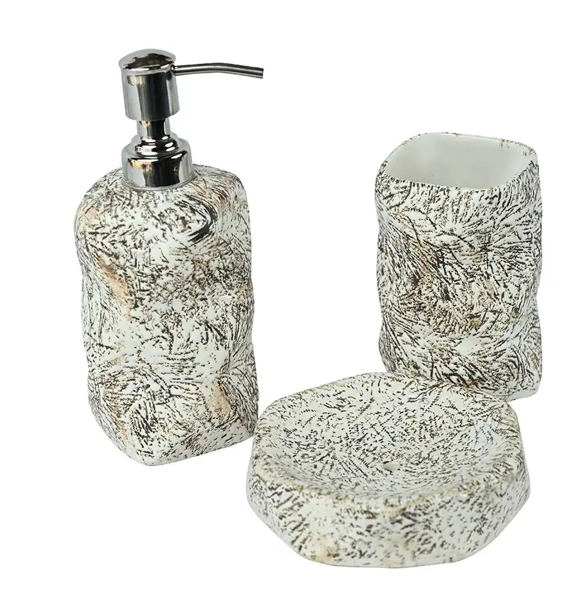 The set consists of one soap dispenser, one soap tray and one toothbrush holder