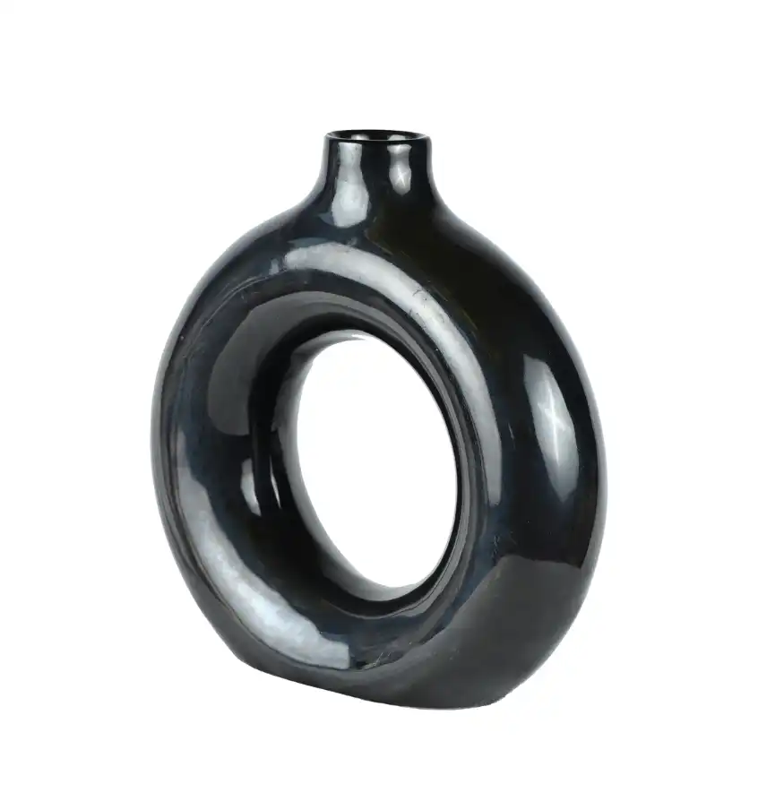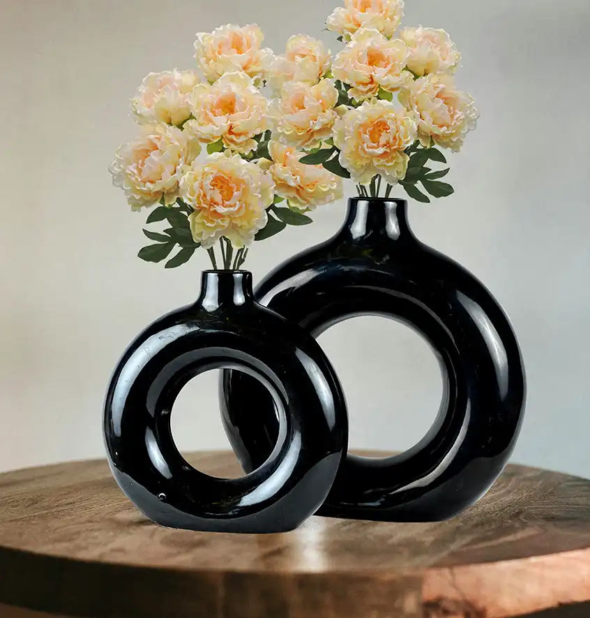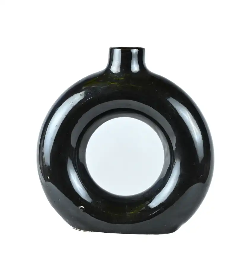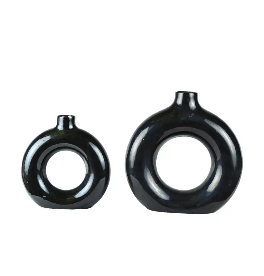 Add a bold, contemporary touch to your decor with the Bloom Donut Vase Set in striking black. Featuring two elegant donut-shaped vases, this set combines minimalist design with modern flair. The deep, matte black finish adds sophistication and versatility, making it perfect for a range of floral arrangements or as a standalone accent piece. Whether placed on your living room console, dining table, or entryway, the Bloom vases make a statement in any space, complementing both modern and industrial interiors.