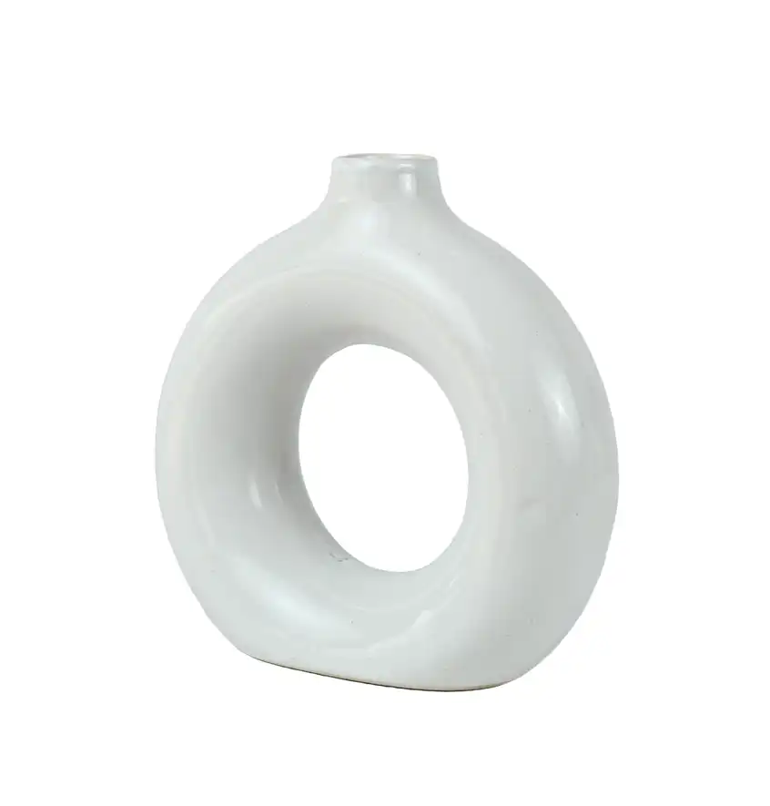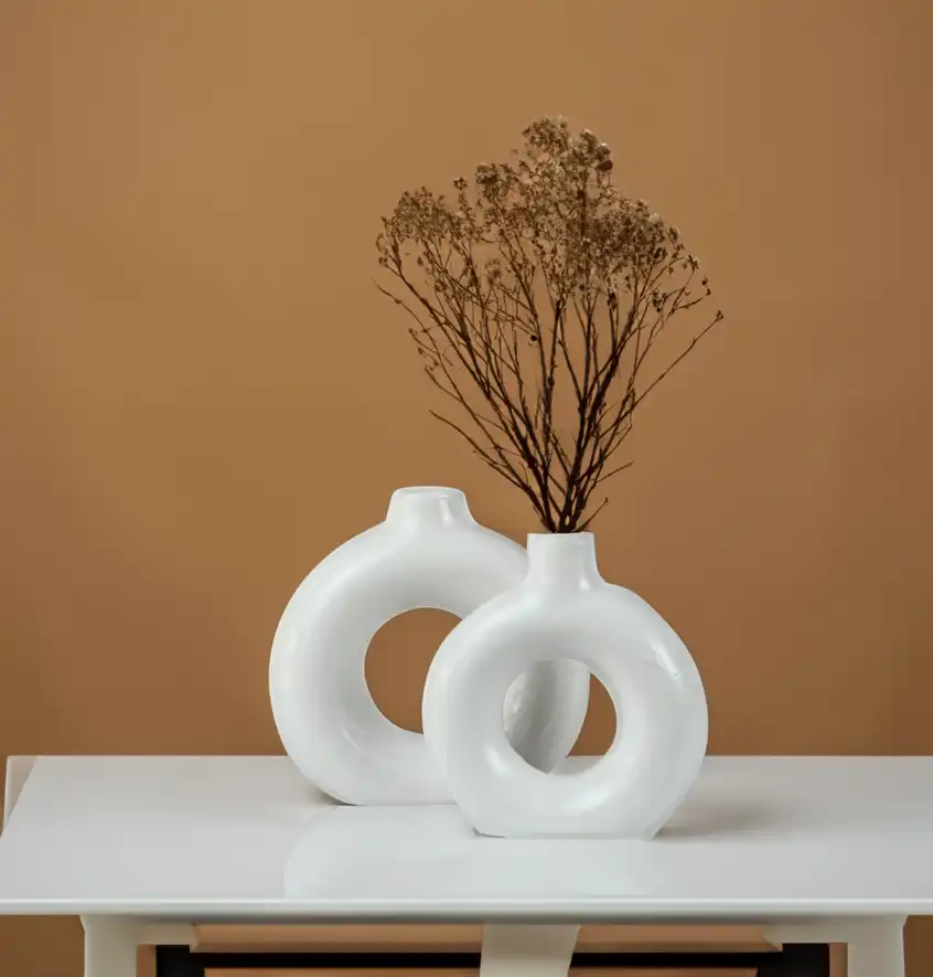 Elevate your home decor with the Bloom Donut Vase Set in elegant white ivory. This set features two beautifully crafted donut-shaped vases, offering a sleek, modern design with a touch of timeless sophistication. The smooth, ivory finish enhances the minimalist aesthetic, making these vases perfect for displaying fresh flowers, branches, or as standalone decor pieces. Whether placed in your living room, bedroom, or entryway, the Bloom vases add a refined, artistic touch to any space.