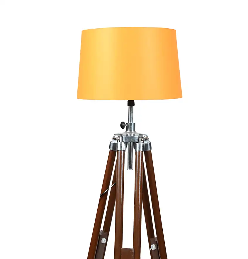The adjustable legs are crafted from wood, the frame is made of metal, and the shade is fabric (Yellow Color).