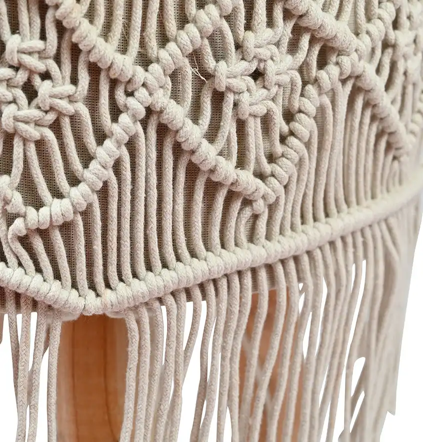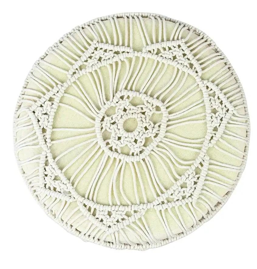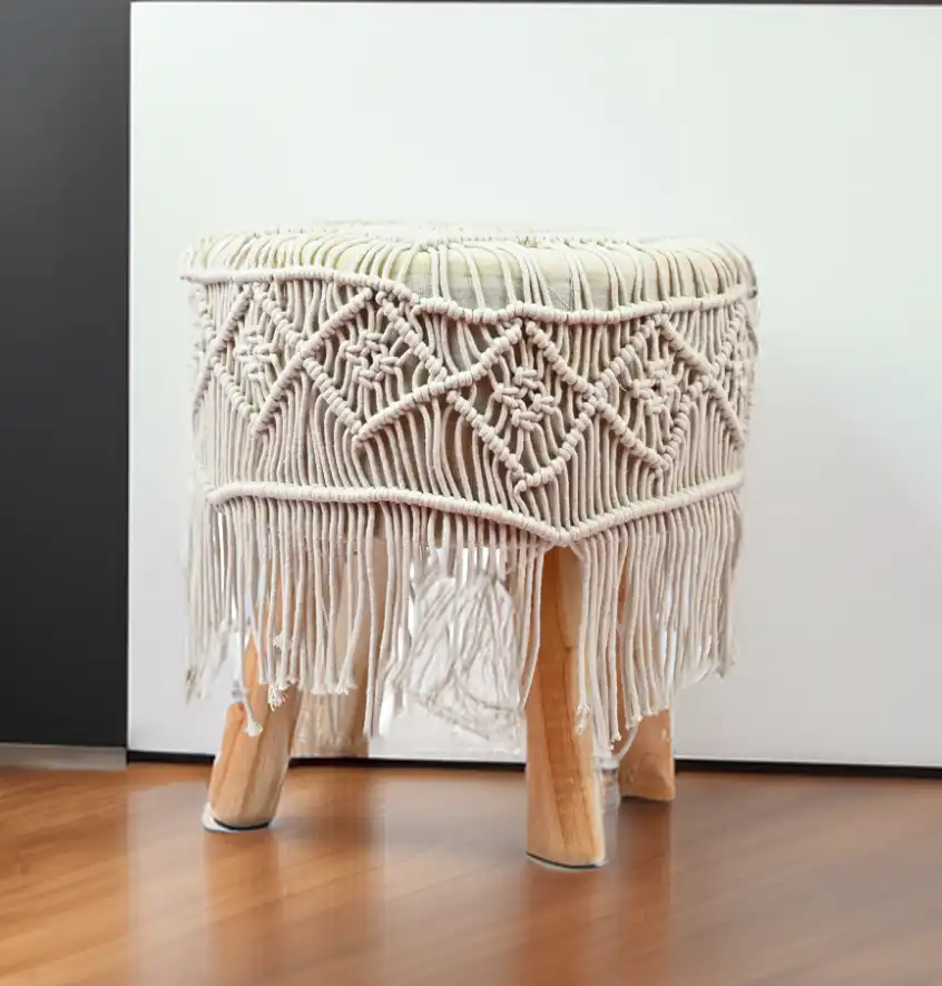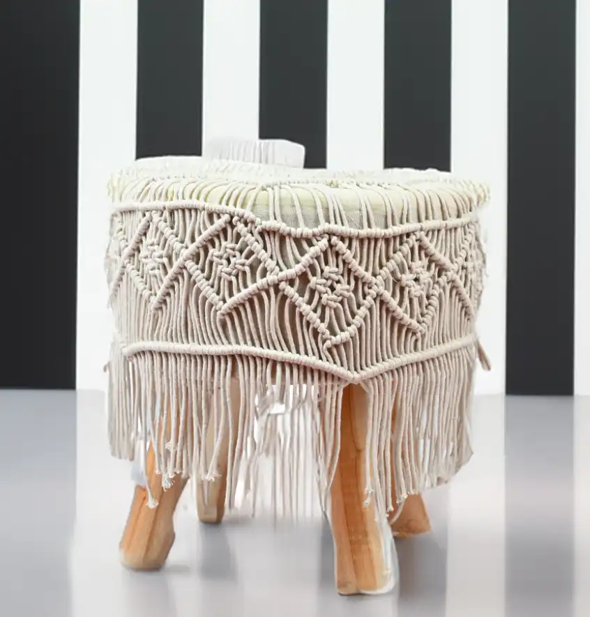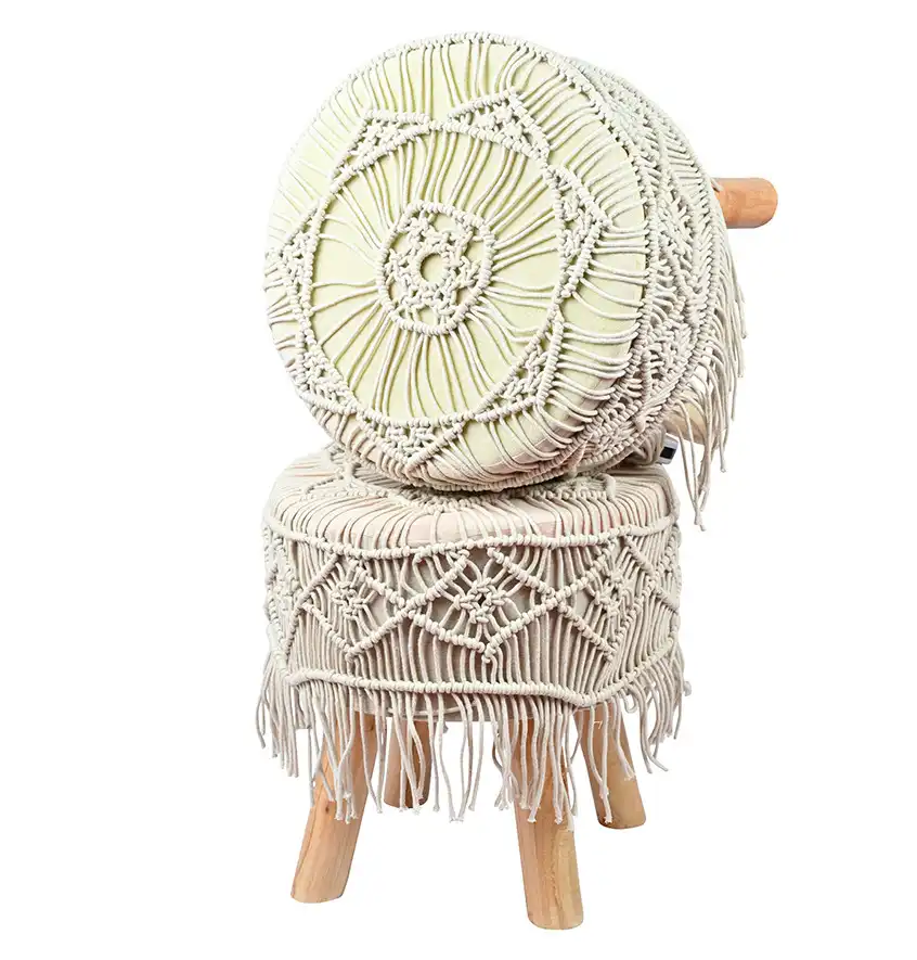 This bohemian inspired product features a sturdy wooden frame (legs) and the seat is adorned with handwoven macrame fabric