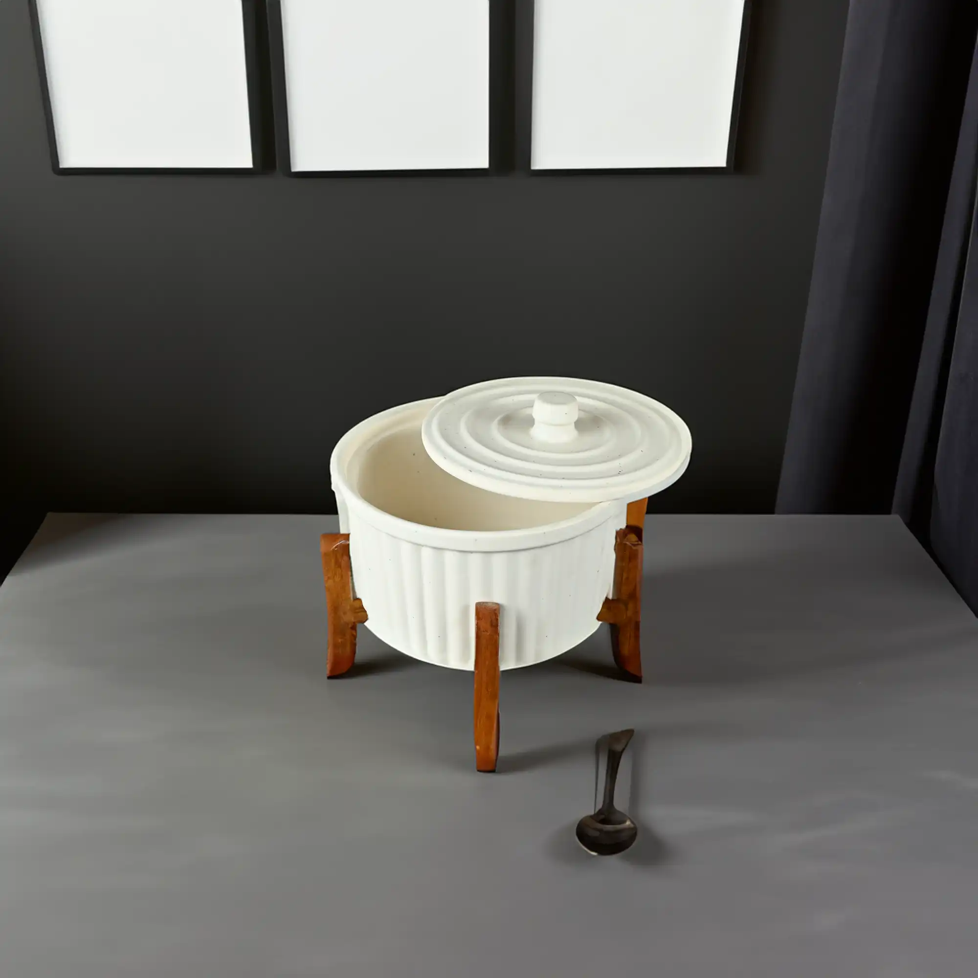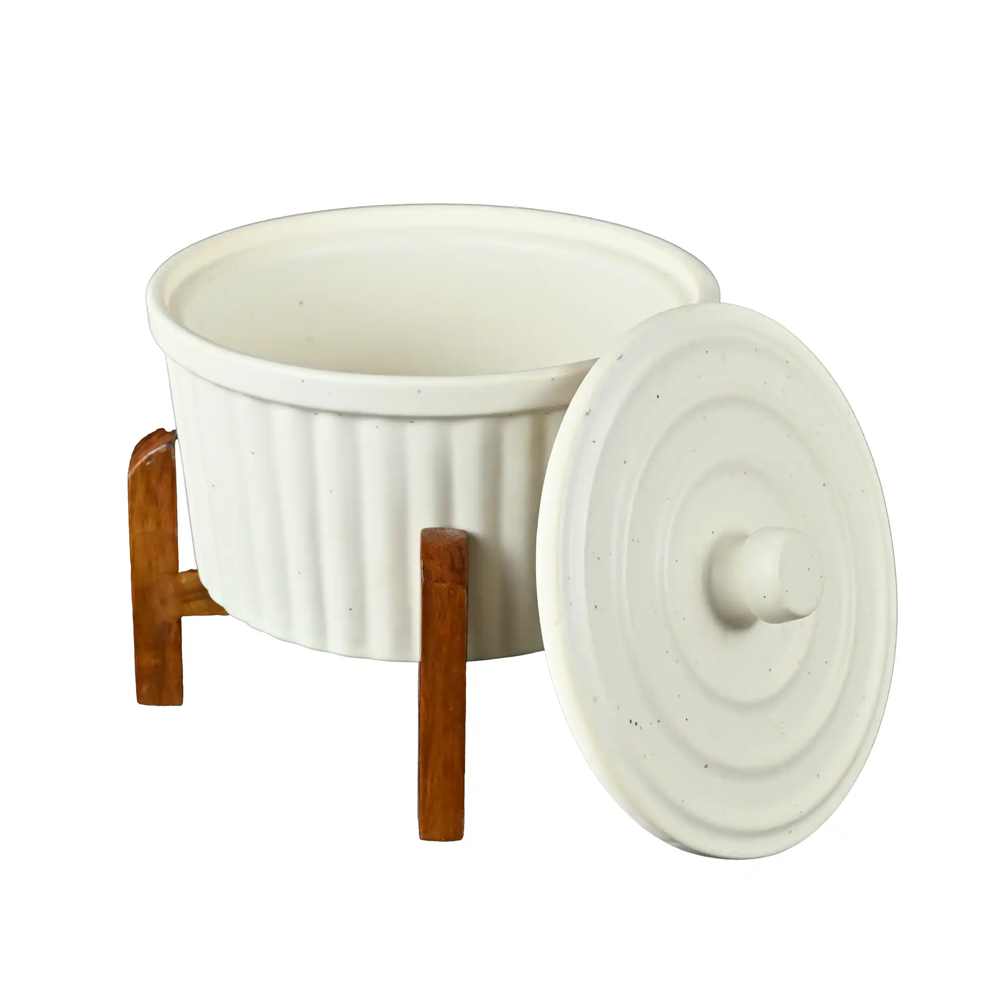 • Premium ceramic serving pot with a lid and matching base.
